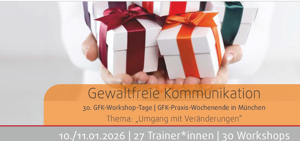 Netzwerkes Gewaltfreie Kommunikation München e. V. lädt zu den 30. Münchner GFK-Workshoptagen ein. An diesem Wochenende laden 27 verschiedene Trainer*innen dazu ein, die Gewaltfreie Kommunikation in unterschiedlichen Anwendungsbereichen in Beruf und Alltag kennen zu lernen. Bei täglich 3 Workshop-Zeiten kann man an bis zu fünf Workshops an diesem Wochenende teilnehmen. Einsteiger*innen und Fortgeschrittene wählen ihr Programm aus vielfältigen Angeboten.